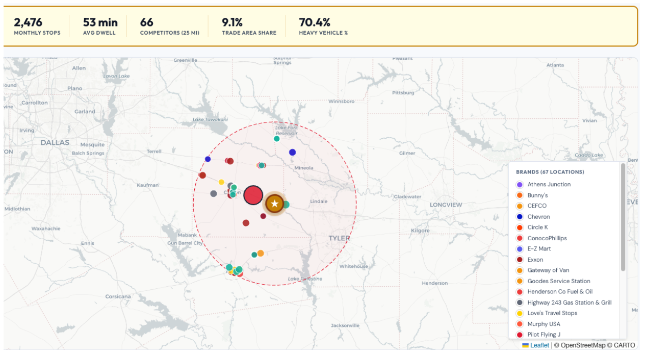 The combined solution is designed for petroleum and gas network operators, truck stop chains, logistics real estate analysts, and any organization that needs to understand how commercial vehicle traffic moves through a competitive landscape.