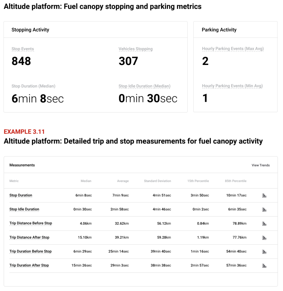 An example of this type of data can be found in a recent fuel retailer report from Altitude by Geotab, which analyzed fueling behavior at a canopy location. The study reported 848 stop events from 307 trucks with a median dwell time of 6 minutes and 8 seconds.